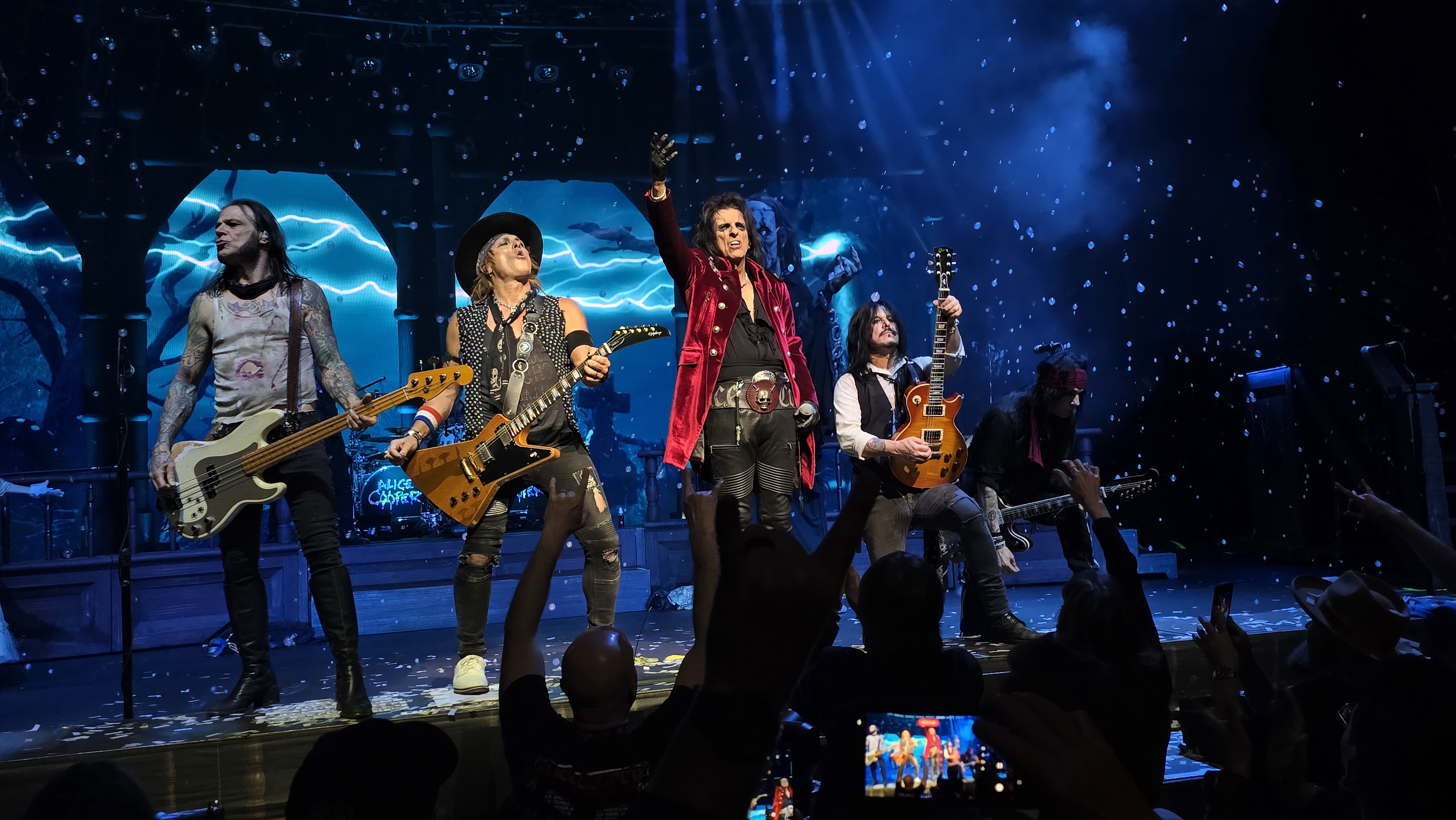 Getting to the theatrics, the “Too Close For Comfort” show is starting to become one of my favorite stage setups in Cooper’s career — having seen it live three times now certainly helps its favorability to some degree, but it’s genuinely such a great sequence of events from beginning to end. The way Cooper enters the stage, cutting through a curtain that looks like the front page of a newspaper saying Cooper’s banned in the state he’s performing in and immediately kicking into the verse of the underrated banger “Lock Me Up,” is an incredible way to get the show started and get the crowd amped up from the jump. The video screens at the back of the stage also provide new visual opportunities that previous tours maybe lacked one way or another. Of course, there’s also the classic theatrical beats like the Franken-Alice during “Feed My Frankenstein,” the crutch during “I’m Eighteen,” the dollar bills shooting into the crowd during “Billion Dollar Babies,” and so much more. Cooper’s wife, Sheryl Cooper, also has some very memorable appearances, with one of the highlights being her eager decaptitation of Cooper towards the end of the set. As stated earlier, the show never stops either — the pauses between songs are extremely short, and Cooper doesn’t speak to the audience between songs either. Instead of introducing the next song, they just rip right into it. Wasting no time, the band truly makes the most of their time by playing as many songs as possible in the time allotted, which I appreciate as a hardcore fan.