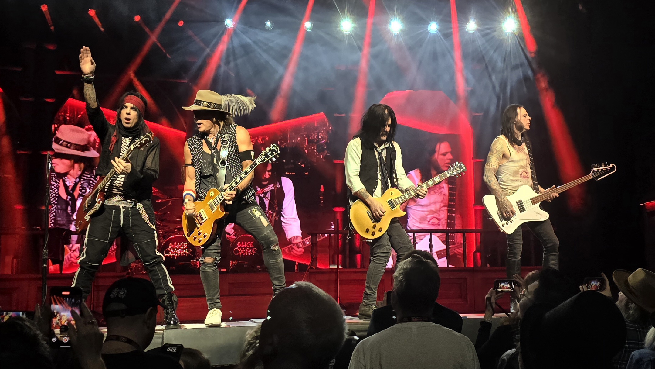 This was also the best Alice Cooper show I’ve seen so far on a musical level, particularly with Cooper’s vocals — don’t get it twisted, he’s never had a bad performance, but his voice was noticeably stronger during this show compared to the Wilmington show, with some examples taking place during songs like “Be My Lover,” “Welcome to My Nightmare,” and “Ballad of Dwight Fry.” The talent and chemistry of Cooper’s backing band is also always a sight to behold and not go unnoticed — having had the same lineup for around a decade now, it’s nice to see the crowd show the same enthusiasm for the rest of the band that they do for Cooper himself. Glen Sobel does a phenomenal job of holding things down on the drumset while occasionally experimenting with subdivisions that deviate from the recordings of the songs but still work well in a live setting. Bassist Chuck Garric is an absolute monster both on the bass and with his backing vocals, and guitarists Ryan Roxie and Tommy Henriksen are always keeping the crowd on their toes with their stage presence and pick-throwing abilities. In the absence of guitarist Nita Strauss for this tour, former Guns n’ Roses guitarist Gilby Clarke filled in and fit into the rest of the band so perfectly. Having performed with the likes of Slash’s Snakepit and Nancy Sinatra, I was confident he would cover Cooper’s territory well, regardless of the short notice, and I’m glad to be proven right after seeing him perform in Greensboro.