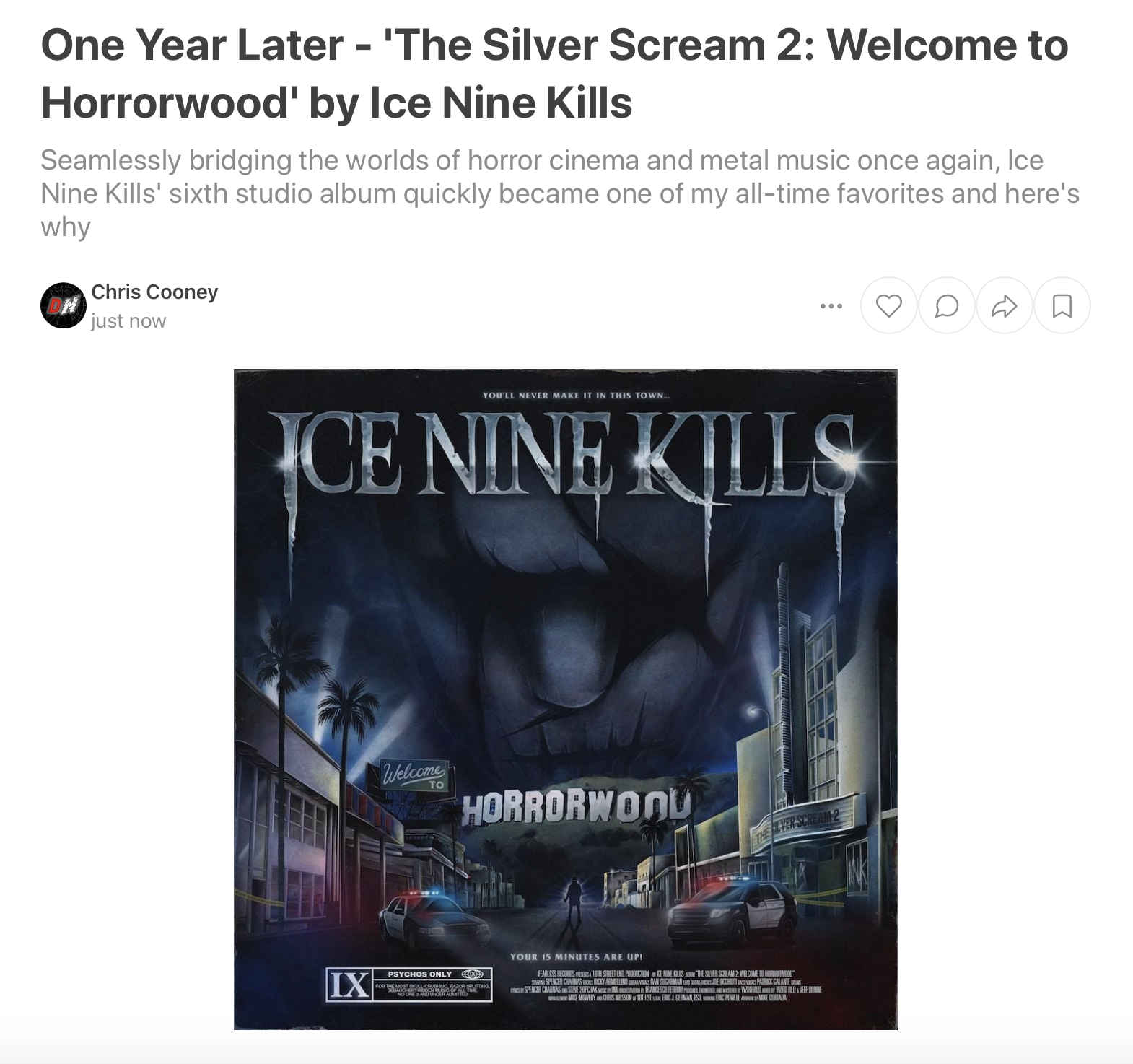 It would be VERY easy to choose the first article I wrote for the blog, celebrating the 100th anniversary of the German vampire classic Nosferatu: A Symphony of Horror — there's a sentimental value with it being the first, it provided a sort of blueprint for my YouTube show 'Monster Memories,' and I feel like it's just one of my more impactful pieces. However, I think I topped it back in October with my celebration of the one-year anniversary of one of my all-time favorite albums, The Silver Scream 2: Welcome to Horrorwood by Ice Nine Kills.